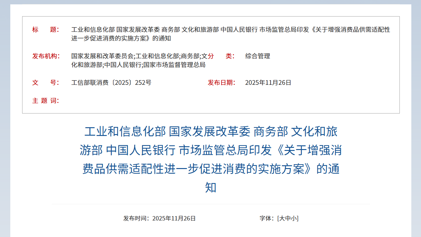 在经济高质量发展的关键时期,消费作为经济增长的重要动力,其作用愈发凸显。2025年11月26日,工信部联合国家发改委、商务部、文旅部、中国人民银行、市场监管总局共同印发了《关于增强消费品供需适配性进一步促进消费的实施方案》(以下简称《实施方案》),不仅为消费品行业指明了未来发展方向,更为我国经济的持续健康发展注入了强劲动力。